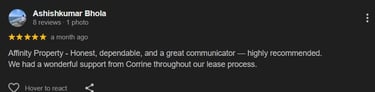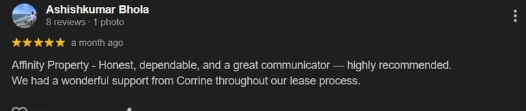 "Honest, dependable and a great communicator- Highly recommended- We had great support from Corrine throughout our lease process." -